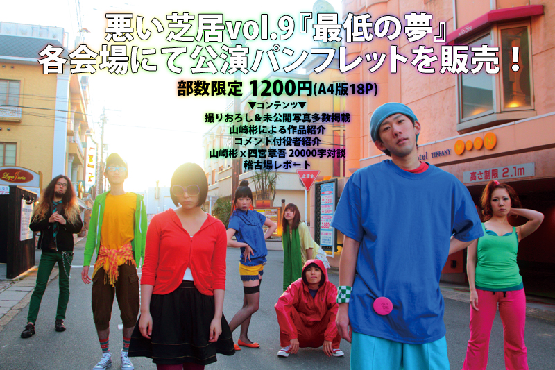 たくさんのご来場、誠にありがとうございました!! 12月6日 WEBCM映像 第3弾公開!! 12月3日 WEBCM映像 第2弾公開!! 11月23日 京都公演全日程終了しました! たくさんのご来場、誠にありがとうございました!! 11月22日 四日目終了しました! 11月21日 三日目終了しました! 11月20日 ニ日目終了しました! 11月19日 初日終了しました! 11月19日 『最低の夢』開幕しました!! 11月7日 パンフレット情報を掲載しました!! 11月1日 あらすじを公開しました!! 10月26日 置きチラシリストを掲載しました!! 10月11日 WEB祭終了!!たくさんのご予約、ご声援、本当にありがとうございました!! 10月10日 WEB祭 開催中!! 10月10日 WEBCM映像 最終話公開!! 10月10日 前夜祭終了!!たくさんのご視聴ありがとうございました! 10月9日 WEB祭前夜祭!!! 10月9日 悪い芝居への質問BOX設置!! 10月8日 WEBCM映像 第十話公開!! 10月7日 WEBCM映像 第九話公開!! 10月6日 WEBCM映像 第八話公開!! 9月26日 四宮デリバリーチケットにてチケット先行予約受付開始!! 9月26日 WEBCM映像 第七話公開!! 9月25日 WEBCM映像 第六話公開!! 9月23日 WEB祭 詳細情報公開!! 9月18日 ブログパーツ公開!! 9月18日 WEBCM映像 第五話公開!! 9月16日 WEBCM映像 第四話公開!! 9月16日 団体紹介・過去公演ページ公開!! 9月14日 WEBCM映像 第三話公開!! 9月13日 WEBCM映像 第二話公開!! 9月12日 WEBCM映像 第一話公開!! 9月12日 特設サイト本公開!! |