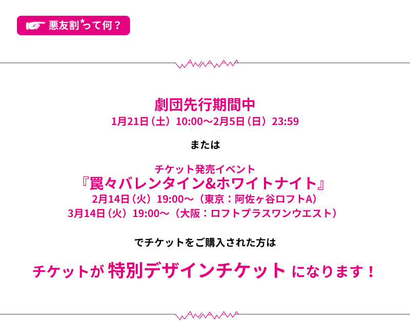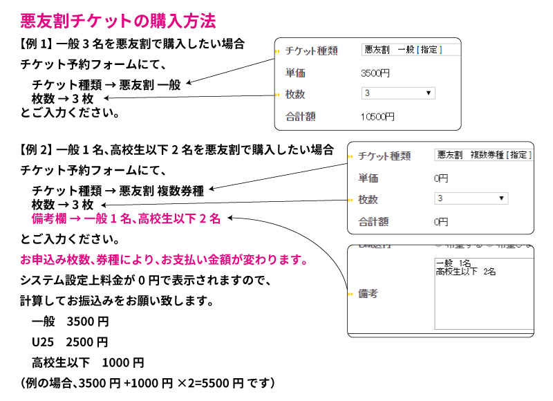 前売 一般 3900 円 U25 3000 円 高校生以下 2000 円 悪友割 一般 3500 円/人 U25 2500 円/人 高校生以下 1000 円/人